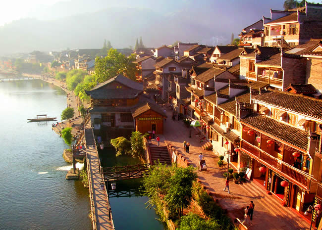 湖南鳳凰古城始建于清康熙四十三年〔1704年〕,歷經(jīng)300多年的風(fēng)雨滄桑,古貌猶存,F(xiàn)東門和北門古城樓尚在。城內(nèi)青石板街道,江邊木結(jié)構(gòu)吊腳樓,以及朝陽(yáng)宮、古城博物館、楊家祠堂、沈從文故居、熊希齡故居、天王廟、大成殿、萬(wàn)壽宮等建筑,無(wú)不具古城特色。古城以古街為中軸,連接無(wú)數(shù)小巷,溝通全城。古街是一條縱向隨勢(shì)成線、橫向交錯(cuò)鋪砌的青石板路,自古以來(lái)便是熱鬧的集市,如今更加生機(jī)勃勃。鳳凰古城的標(biāo)志性建筑之一虹橋,原名臥虹橋,歷史悠久。鳳凰古城北門城樓本名“碧輝門”,采用紅砂條石筑砌,既有軍事防御作用,又有城市防洪功能,是古城一道堅(jiān)固的屏障。鳳凰古街兩邊建筑飛檐斗拱,店鋪中陳設(shè)著琳瑯滿目的民族工藝品,濃濃的古意古韻,透出古街深厚的民族文化底蘊(yùn)。