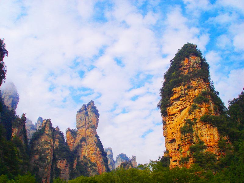 天門山國(guó)家森林公園四面絕壁,雄偉壯麗。保存著完整的原始次生林,植物資源豐富,有世界罕見(jiàn)的高山珙桐群落。天門山文化底蘊(yùn)深厚,留有大量贊詠天門山的詩(shī)詞,更有眾多神聞傳說(shuō),被譽(yù)為“張家界之魂”。山頂天門山寺自唐朝建成以來(lái)香火鼎盛,寺外有七級(jí)浮屠,掩映于青枝綠葉中,古雅幽清。善男信女入寺拜佛,撞鐘響徹天際,擊鼓震動(dòng)山岳,香煙裊裊如云。明萬(wàn)歷年間南岳僧在此傳經(jīng)授戒,從此聞名遐邇,朝山拜佛者達(dá)周邊四郡十余縣,信士遍及湘西北,天門山因此成為 “湘西第一神山”。天門山終年云霧繚繞,云海景象變化無(wú)窮。山間溶丘、石芽廣布,奇石秀木及珍禽異獸繁多,更有飛瀑流泉噴涌而出。天門山兼峰、石、泉、溪、云、林于一體,集雄、奇、秀、險(xiǎn)、幽于一身,被譽(yù)為空中原始花園。天門洞、天縫渡仙、五指山、將軍石等是有名的峰林景觀,還有神秘的千佛洞等待你的探奇;山間的韓家溝則是富蘊(yùn)滿族風(fēng)情的村落——這里久居的幾十戶滿族農(nóng)家至今仍完好保留著其在語(yǔ)言、飲食、衣著、居住以及婚慶殯葬等方面的滿族風(fēng)俗,是難得的民俗文化旅游地。