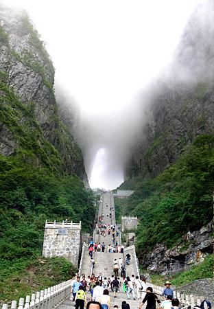 選擇乘索道游覽天門山是最佳視角。索道吊廂一出站房,馬上就騰空飛了起來,從城市的一棟棟樓頂掠過,猶如在城市上空滑翔。翻過一道山梁之后,城市被遠(yuǎn)遠(yuǎn)拋在了視線以外,大片翠綠的稻田映入眼簾,透過打開的通風(fēng)窗口,一陣陣青草水田特有的清香沁入心脾;蚋呋虻偷霓r(nóng)舍不時從我們身下滑過,牛羊們?nèi)齼蓛捎崎e的在田間浮動著,靜謐、安詳。再翻過一座山峰,我們便立即被滿山的青翠所包圍,萬仞絕壁也已投懷送抱。索道支架矗立于絕壁天險(xiǎn)中,或挺立或傾倒或探頭或擁抱,我們繼續(xù)在艱險(xiǎn)中游歷,時而隱沒于云堆,時而出世于蒼穹。這時你除了那滿懷的驚險(xiǎn)刺激外有的便只有望索而興嘆了。我拍了很多片子,但是總覺得還是沒有足以記錄下來這座空中盆景的壯麗。