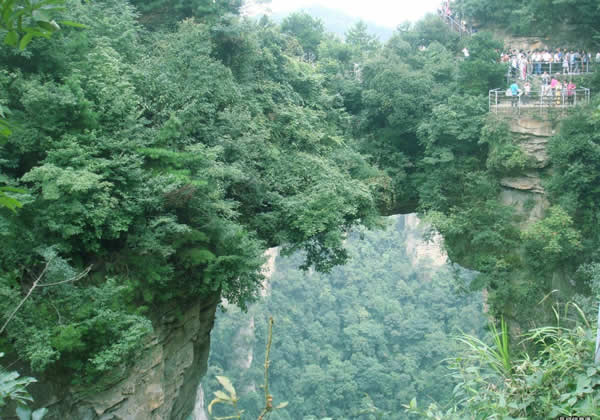 在砂刀溝盡頭右側,袁家界左面南沿,一天然石橋凌空飛駕于兩座巨大的石峰之巔,厚約4米,寬2米余,跨度約50米,相對高度400多米。橋面兩端石峰上,綠樹叢簇,郁郁蔥蔥,峰壁則宛若斧劈,草木不生。立橋邊俯視,透過稀疏樹葉,見云涌霧蒸,幽深莫測。自北端步行過橋,狹窄處僅數(shù)十厘米,心驚卻步。繞過深谷,站在相距40多米處觀橋臺上,橋的全貌映入眼簾,橋身雄奇?zhèn)グ丁?