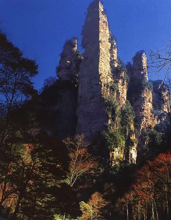 金鞭巖:過“閨門峰”沿溪而下約500米,有一座高約400米,孤標直立,雄奇挺拔的奇峰,名金鞭巖。金鞭巖是武陵源著名景點,峰體上細下粗,四棱分明。棱面布滿節(jié)理橫紋,形成鞭節(jié),渾如一根豎插大地的長鞭。每當夕陽晚照,鞭身涂金,熠熠閃光,瑰麗奪目,構成一幅奇特壯美的“夕陽金鞭圖”。