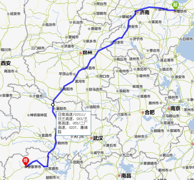 濰坊去張家界自駕車自助游線路圖全程高速):