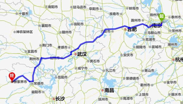 左右,沿途經過鎮(zhèn)江——南京——合肥——六安市——麻城市——仙桃市——潛江市——荊州市——常德市(這里可以不走常德,直接從荊州經澧縣、石門縣到慈利縣)——慈利縣——張家界。