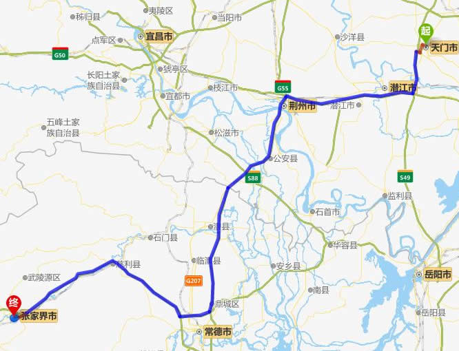 左右,沿途經過天門市——潛江市——荊州市——公安縣——澧縣——常德(也可以走國道經澧縣、石門縣)——慈利——張家界。