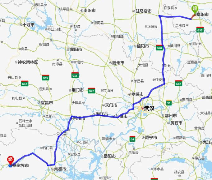 阜陽(yáng)去張家界自駕車自助游線路圖全程高速):